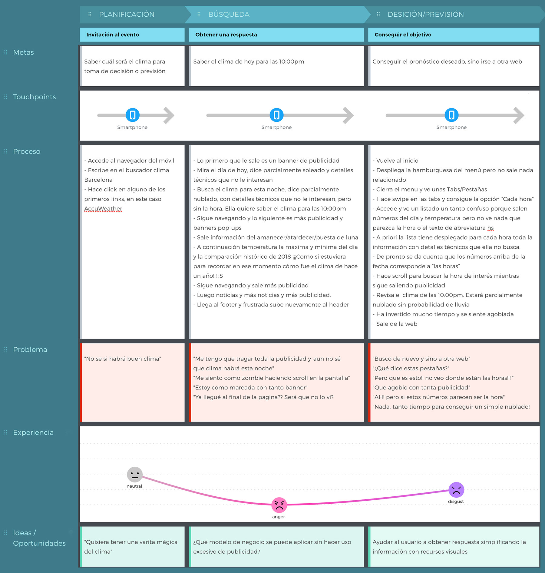 El resultado del Customer Journey map muestra a un usuario insatisfecho por invertir mucho tiempo en la búsqueda, agobiado por la publicidad, frustrado por no entender ni ver los resultados del clima que busca, y el cual termina su experiencia consiguiendo lo que buscaba pero sintiéndose molesto.